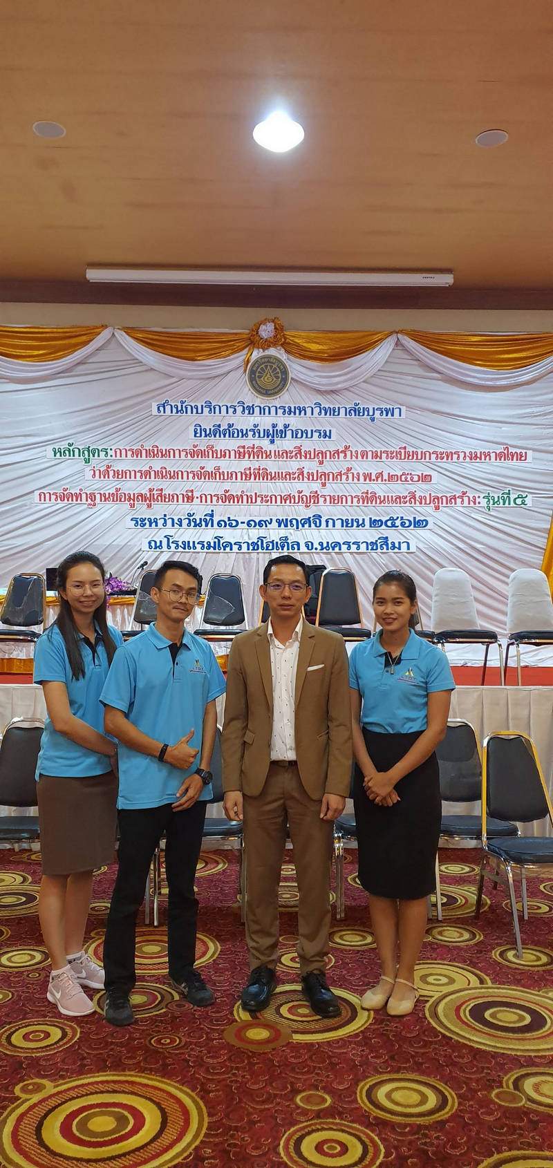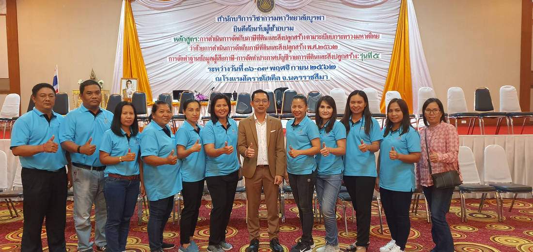 รุ่นที่ 5 BUU โครงการอบรมเชิงปฏิบัติการ หลักสูตร : การดำเนินการจัดเก็บภาษีที่ดินและสิ่งปลูกสร้าง ตามระเบียบกระทรวงมหาดไทยว่าด้วยการดำเนินการจัดเก็บภาษีที่ดินและสิ่งปลูกสร้างฯ ระหว่างวันที่ 16 - 19 พ.ย. 2562 ณ โรงแรมโคราช โฮเต็ล จ.นครราชสีมา